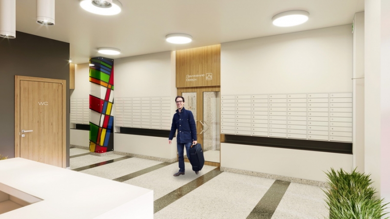 Из холла предусмотрено два выхода – как к улице, где будут обустроены стоянки для автомобилей, так и в тихий внутренний двор. Маме с коляской вовсе не нужно обходить все здание, чтобы выйти на дорожки тихого внутреннего двора!