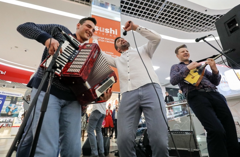 И снова смена ритма – и десять кавер-бэндов на всех этажах торгового центра в унисон заиграли знаменитую композицию «Знай, это любовь!» «Ляписов», а на центральной сцене четверо солистов пели. И так здорово, с чувством, что им подпевал и подтанцовывал весь зал!