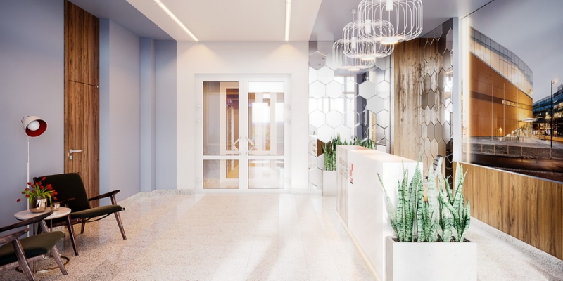 Жителей дома и их гостей первым делом встретит светлое просторное лобби – со стойкой консьержа, зоной ожидания курьера, санитарной комнатой с пеленальным столиком и байк-боксом. Отделка гранитом пола и входной группы, гранитные порталы лифтовых шахт, светлые стены и «финские» мотивы в дизайне – это будет смотреться просто здорово!