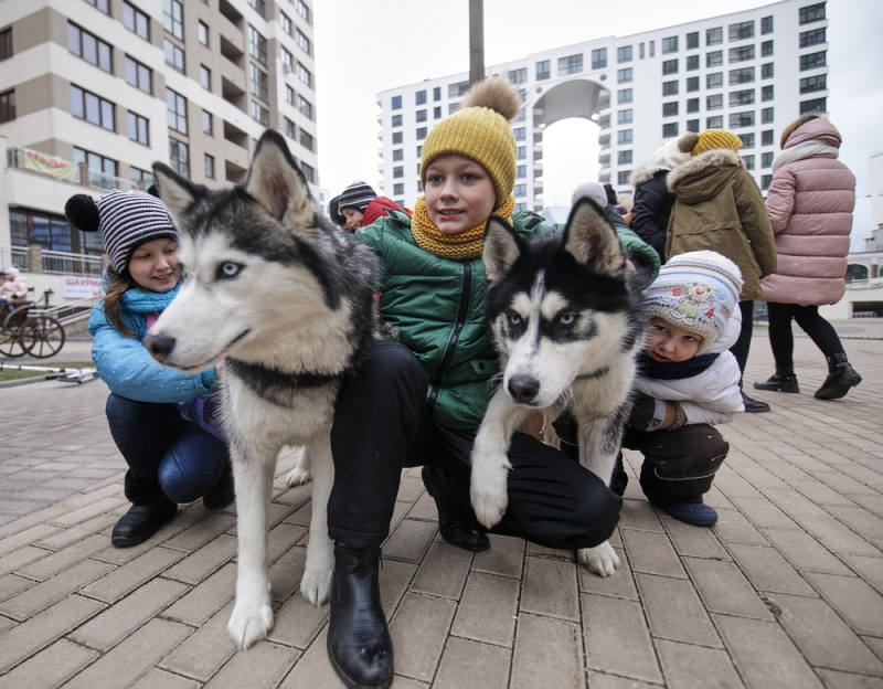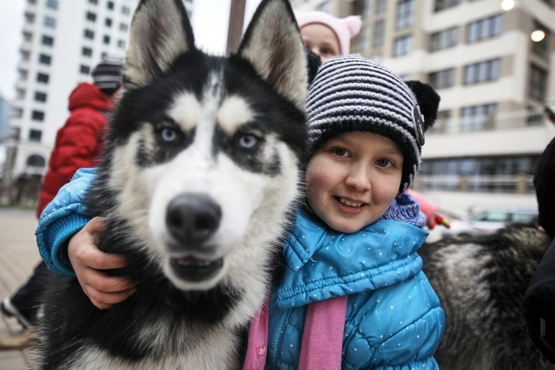 А вторая фотозона – живая! Четыре красавицы-хаски позировали с неподдельным удовольствием. Эти собаки просто обожают детей. Они позволяли себя гладить, обнимать, чуть ли не целовать – такие милашки! Ребят разных возрастов от собак было буквально не оторвать, а хаски лишь улыбались и сверкали голубыми глазами от радости. У людей ведь сегодня праздник!