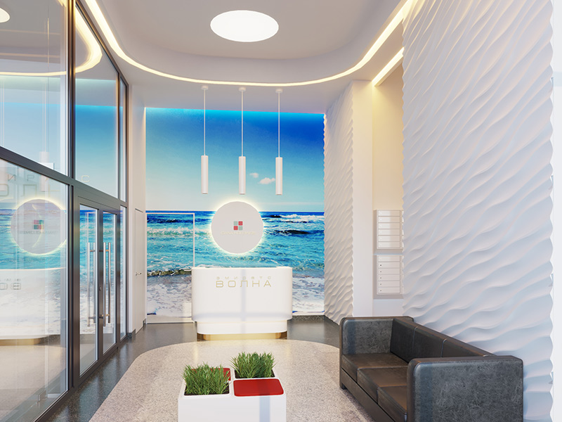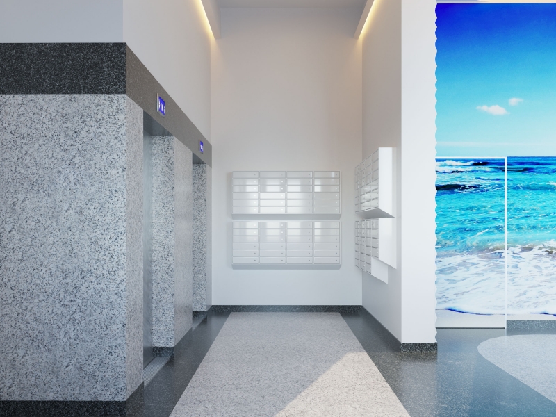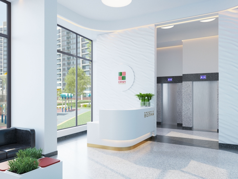 Вестибюли подъездов просторные, с высокими потолками, которые получат эксклюзивный дизайн в морской тематике. Здесь будут гранитные полы и порталы лифтов. Предусмотрена стойка для консьержа, зона ожидания курьера и туалетная комната с пеленальным столиком.