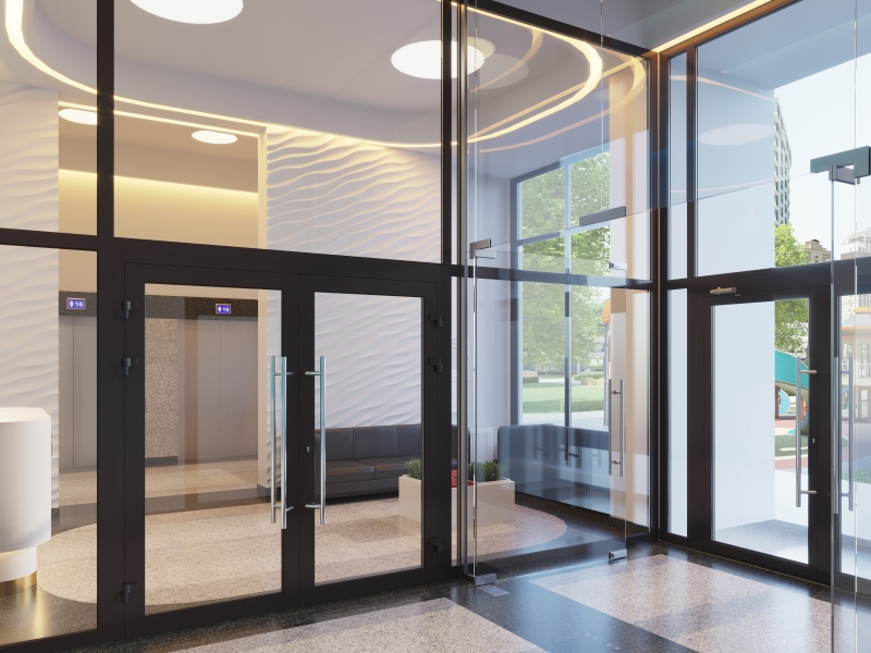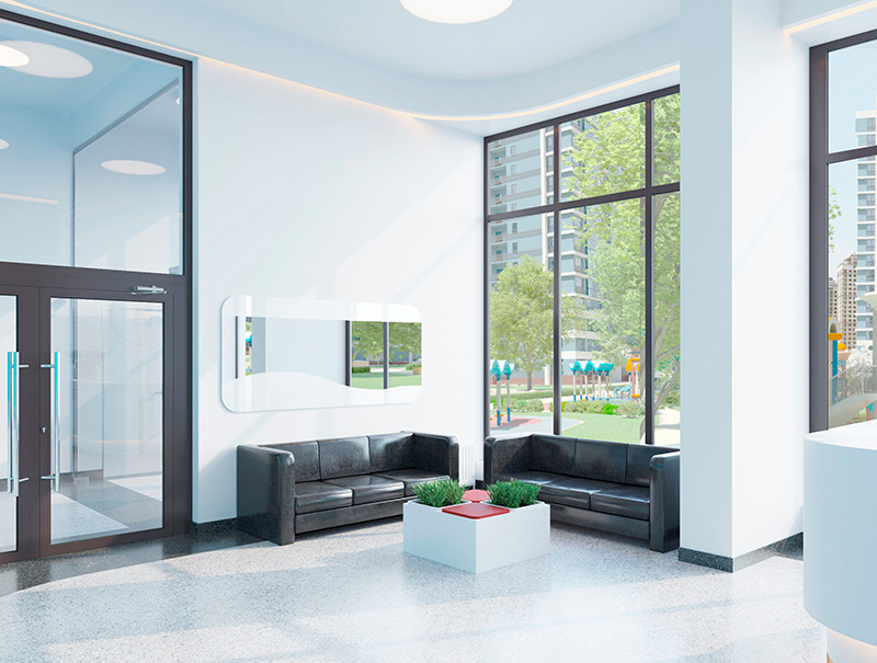 Вестибюли подъездов просторные, с высокими потолками стойкой для консьержа и зона ожидания курьера
