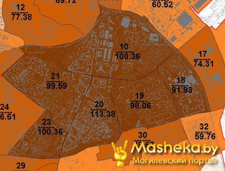 Кадастровая стоимость земли под строительство многоэтажного жилья в центральной части г.Могилева.Верхняя цифра-номер зоны,нижняя-стоимость кв.м земли в дол.США