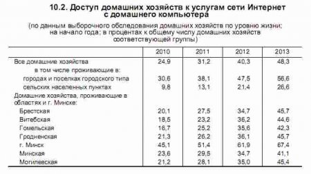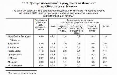 В таблице 10.6 мы видим, что в Могилевской области на начало 2013 года пользовалось Интернетом 44% взрослого населения.Учитывая, что в сельской местности охват Интерентом почти в два раза менбше, чем в городах,можно утверждать, что в самом Могилеве выходит в о всемирную паутину более половины жителей.