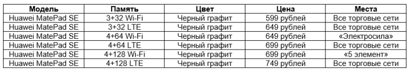 Все планшеты Huawei MatePad SE доступны в цвете «черного графита». Версии с Wi-Fi доступны по следующим ценам: 3+32 ГБ – 599 рублей, 4+64 ГБ – 649 рублей, а 4+128 ГБ – 699 рублей. Планшеты с LTE-модулем немного дороже: 3+32 ГБ – 649 рублей, 4+64 ГБ – 699 рублей, а 4+128 ГБ – 749 рублей.