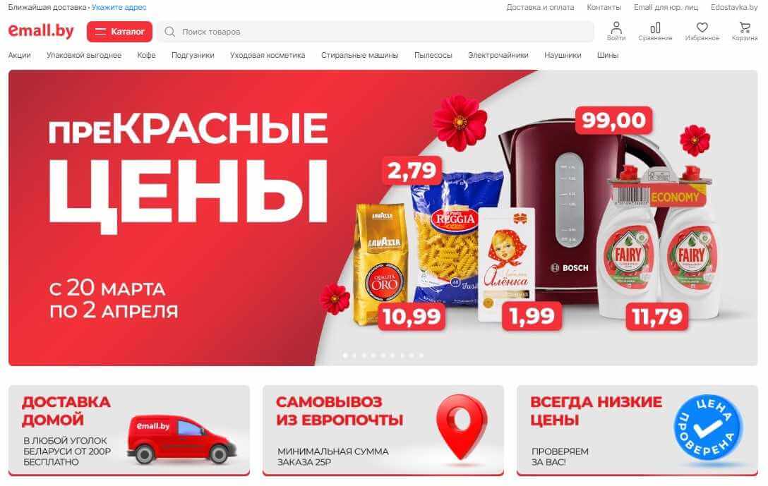 Emall.by начал свою работу в декабре 2021 года и очень быстро заработал широкую популярность в Беларуси. Сервис представляет собой онлайн-дискаунтер, а значит, предлагает низкие цены на весь ассортимент. Пользователи делают заказ через сайт или приложение, когда и где удобно, а затем получают его также удобным себе способом: в пункте выдачи Европочта или с доставкой на дом. Больше не нужно ездить в магазины, стоять в очередях, носить тяжелые покупки. Все это сделает за клиентов Emall.by, еще и с ценами дискаунтера.