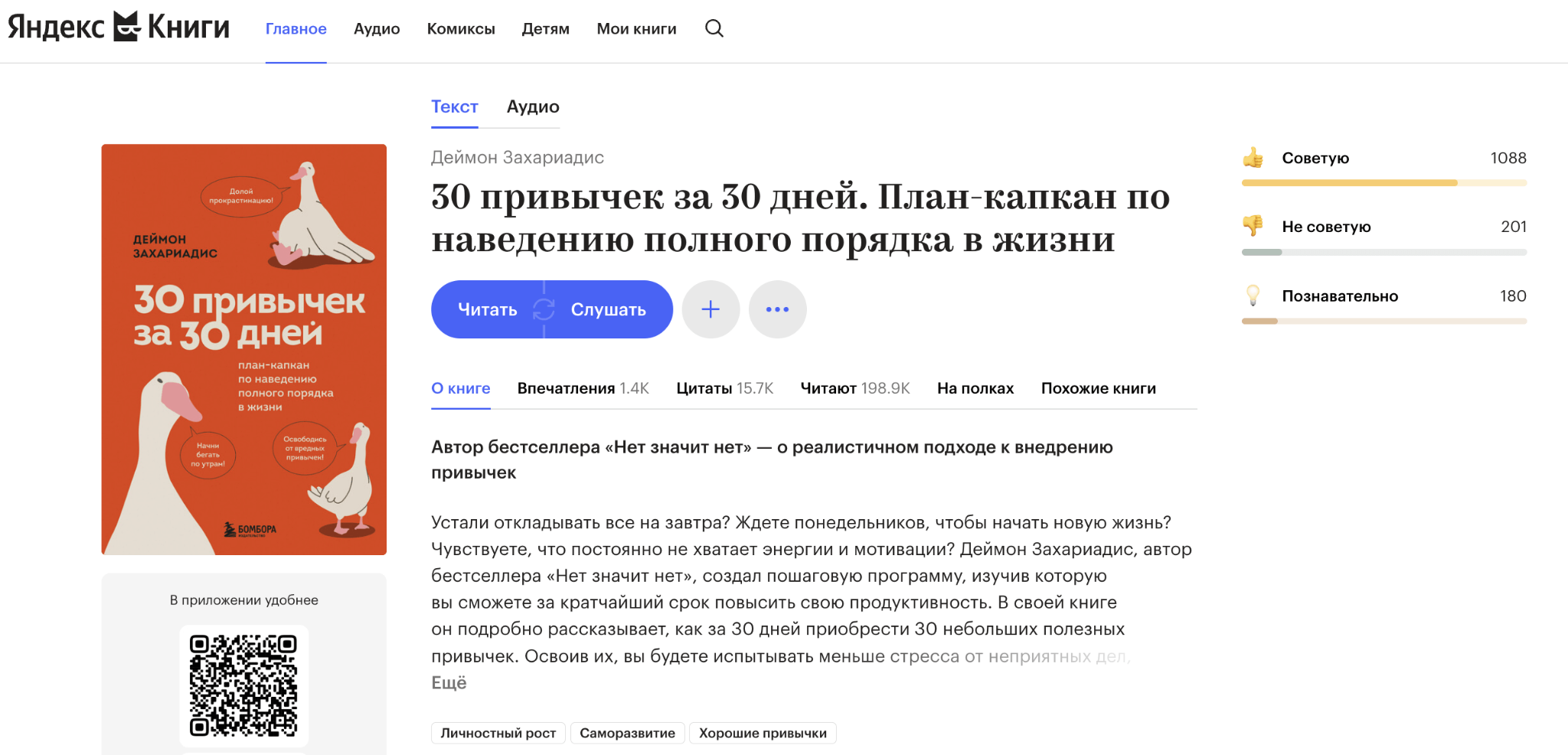 По данным Яндекс Книг, лидером стал нонфикшн «30 привычек за 30 дней» Деймона Захариадиса — практикум по системному саморазвитию. Пошаговая программа помогает мягко вводить новые полезные привычки в свою жизнь, справиться с прокрастинацией и внутренним критиком.
