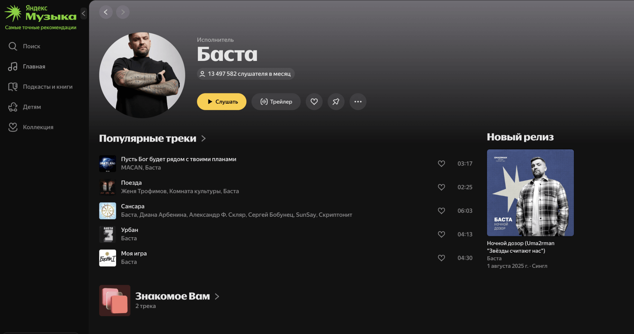 В Яндекс Музыке доминируют поп и рэп-исполнители. С большим отрывом лидирует Баста. На втором месте оказался Xolidayboy, сочетающий в своем творчестве элементы поп, рока и электронной музыки. Третью строчку занимают Artik & Asti, чьи хиты регулярно входят в топы. Недавно дуэт выпустил новый сингл «Я буду ждать тебя» вместе со Стасом Михайловым.