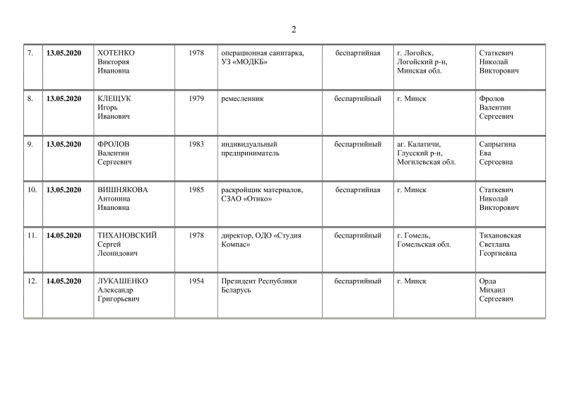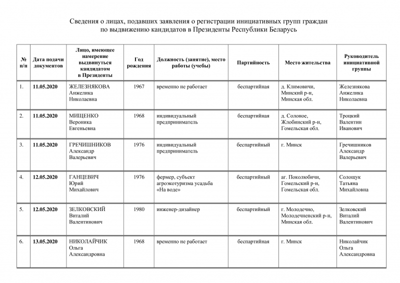 Среди них действующий президент Александр Лукашенко, блогер Тихановский, инженер-дизайнер Виталий Зелковский, фермер из Гомельской области Юрий Ганцевич, а также восемь «кандидатов протеста» из команды Николая Статкевича.