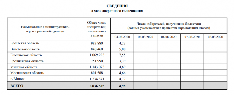 4 августа стал первым днем досрочного голосования на выборах президента Беларуси. В этой день явка составила 4,98 процента. Эти цифры озвучили в ЦИК.