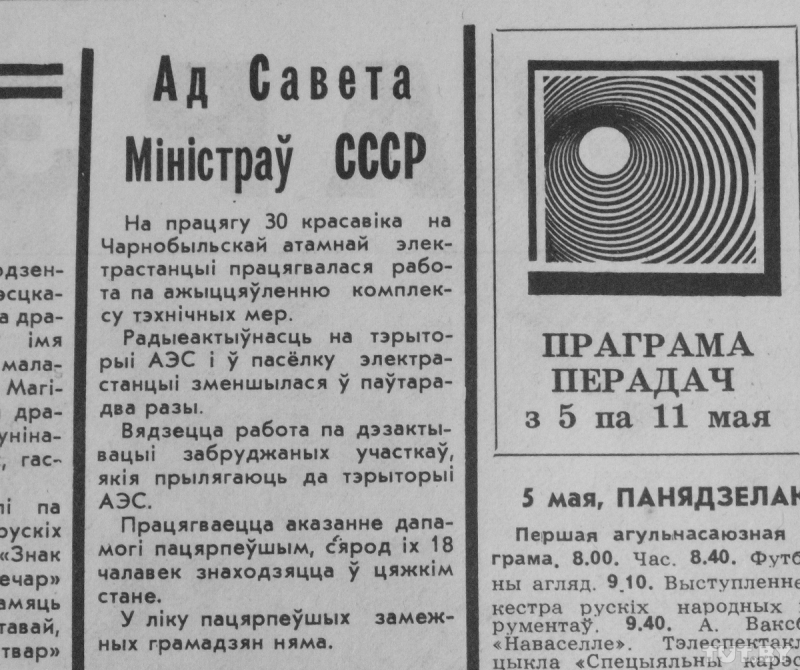 Начиная с 1 мая, короткие сообщения об аварии на ЧАЭС начинают появляться на страницах некоторых центральных газет. Например, минская «Звязда» впервые написала про аварию в праздничном (первомайском) номере. Первая узкая колонка на третьей полосе сообщала о «некоторой утечке радиоактивных веществ» в результате аварии, трех эвакуированных поселках и о том, что уровень радиации снижается. Вот пример сообщения от 2 мая 1986 года: