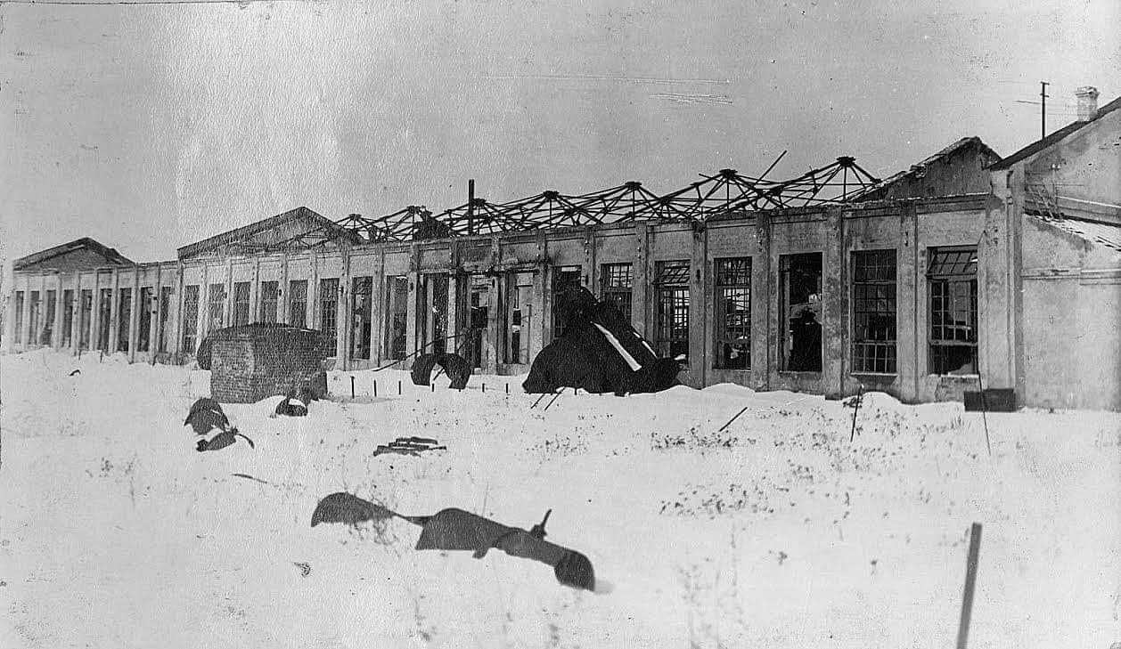 На костеобрабатывающем заводе все здания были разрушены,а оборудование увезено немцами.