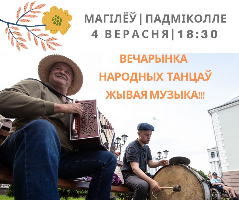 Будуць беларускія народныя танцы пад жывую музыку! Для нас іграюць: нашыя пастаянныя госці з Бярэзані: Міхаіл Папруга (гарманіст-віртуёз) і Раман Яраш (бубен, кларнет, труба), а таксама магілёўскі музыка Кастусь Канцавы (дуда, туба).