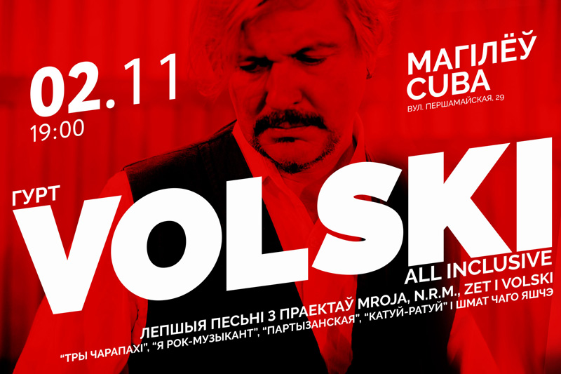 Электрычны канцэрт гурта Volski ў межах туру All inclusive адбудзецца ў Магілёве 2 лістапада. Канцэрт прысвечаны знакавым датам у жыцці праектаў Лявона Вольскага – Мроя, NRM, Zet, Volski.