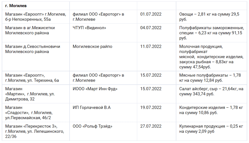 Так, только в могилевском магазине «Мартин» на улице Димитрова выявлены товары, не соответствующие требованиям проверки, на сумму 340 рублей. С истекшими сроками годности здесь обнаружены салат и сыр (вес 21,64 кг).