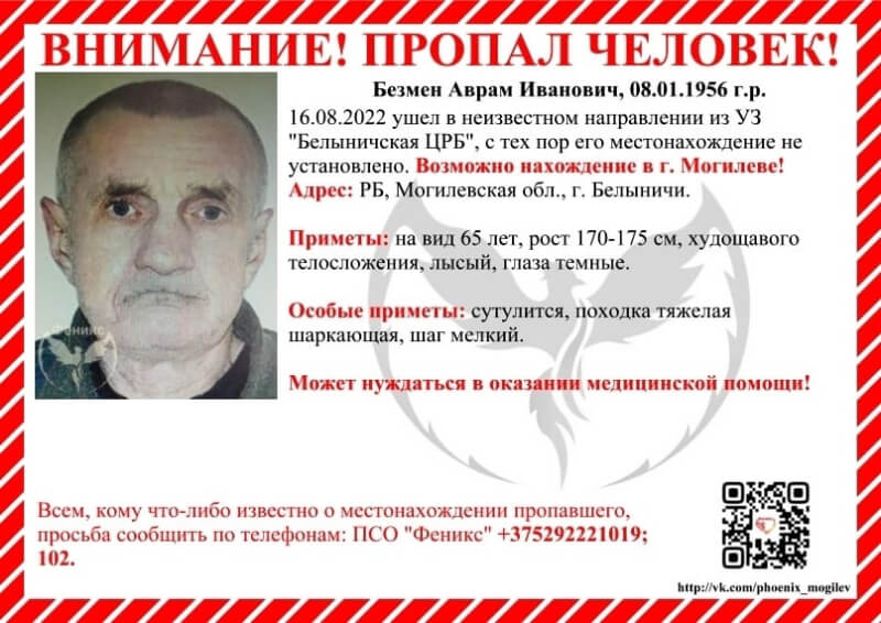 Если вы владеете информацией о местонахождении пропавшего человека, сообщите по телефонам ПСО «Феникс» +375(29)222-10-19 или в милицию по телефону 102.