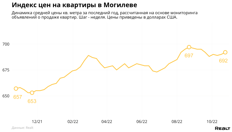 Средняя цена в объявлениях о продаже квартир в Могилеве выросла на 0.3% и составила 692 $/м2.