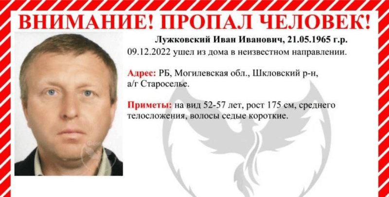 57-летний Лужковский Иван 9 декабря 2022 года ушел из дома в агрогородке Староселье Шкловского района в неизвестном направлении и пропал, сообщает ПСО «Феникс».