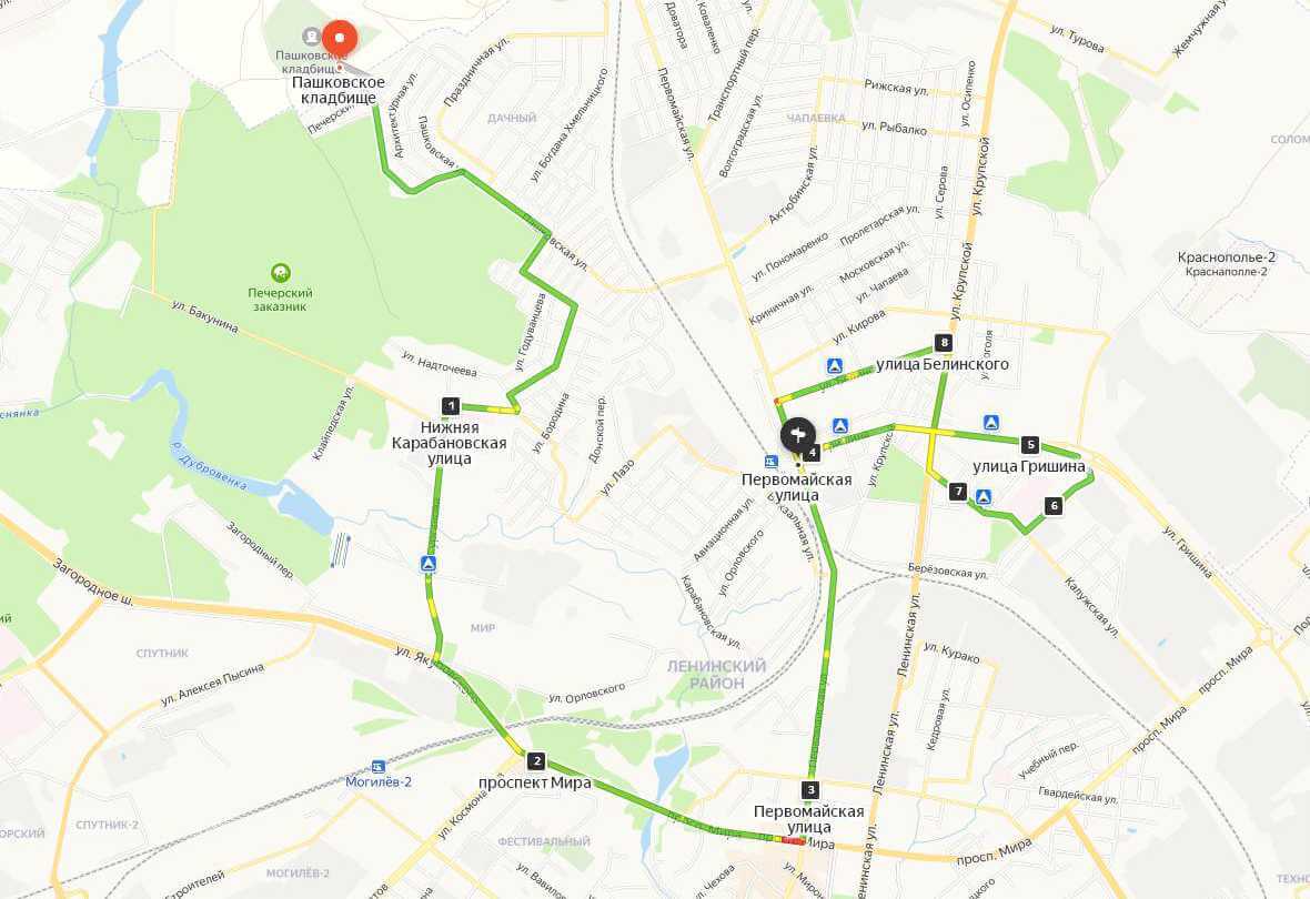 Пашковское кладбище — пер. Печерский — ул. Печерская — ул. Пашковская — 2-й переулок Некрасова — ул. Некрасова — ул. Москвина — ул. Борисовская — ул. Нижняя Карабановская — ул. Сурганова — ул. Якубовского — пр-т Мира — ул. Первомайская — ул. Гришина — пер. Березовский — ул. Калужская — ул. Стасова — ул. Крупской — ул. Белинского — ул. Первомайская — пр-т Мира — ул. Якубовского — ул. Сурганова — ул. Нижняя Карабановская — ул. Борисовская — ул. Москвина — ул. Некрасова — 2-й переулок Некрасова — ул. Пашковская — ул. Печерская — пер. Печерский — Пашковское кладбище.