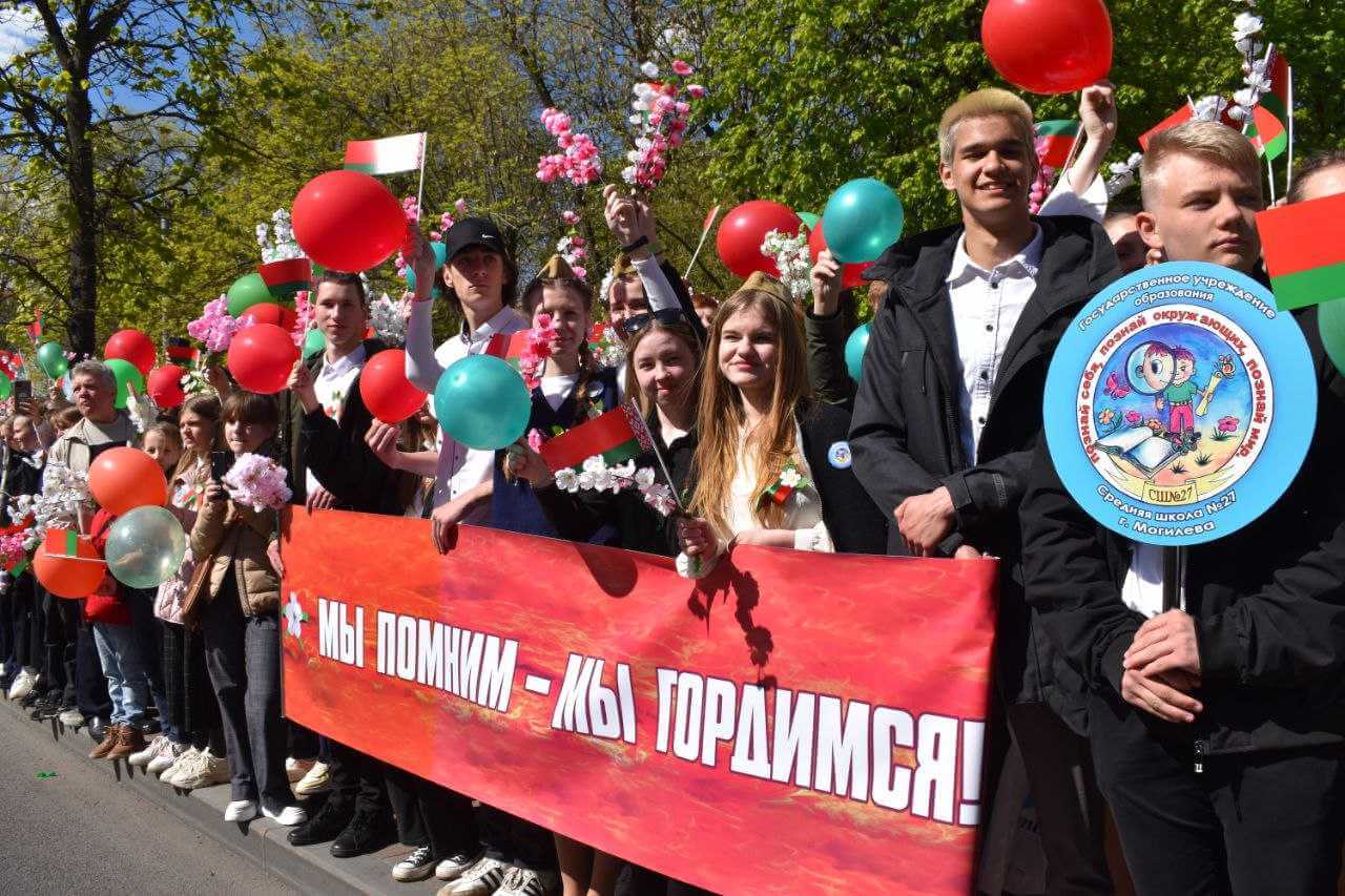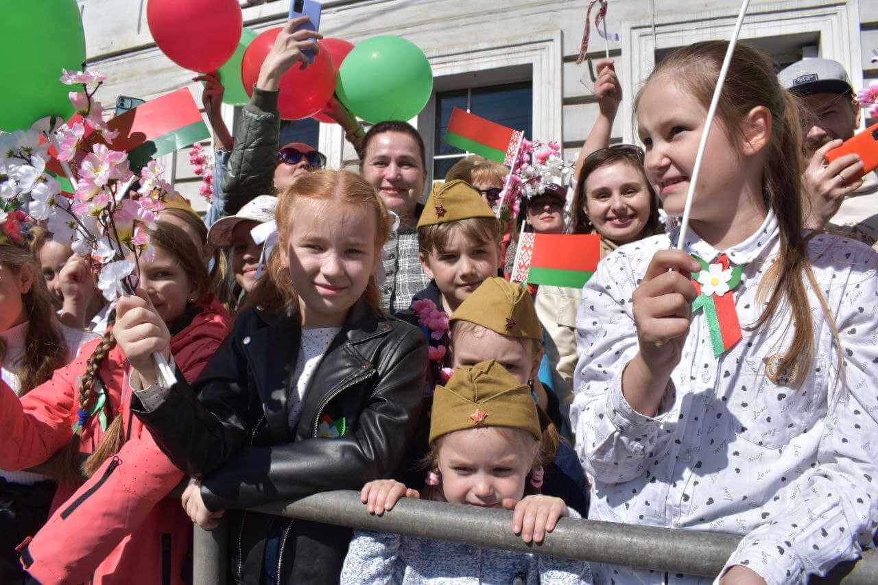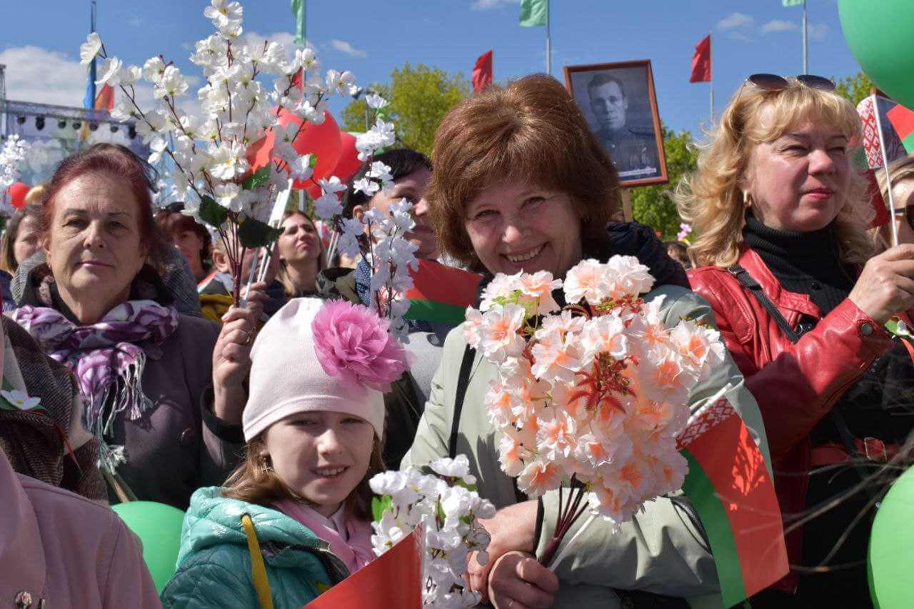 9 мая на главной улице Могилева собралось огромное количество людей. Живой коридор пестрит ветвями яблоневого дерева, республиканскими флагами и портретами героев!