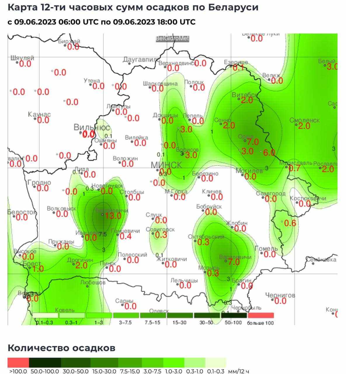 Вчерашние дожди, на которые возлагались большие надежды, прошли только местами. Карта Белгидромета подтверждает это. Могилев так и остался на краю «мокрой зоны». Повезло Орше, где выпало целых 7 мм.