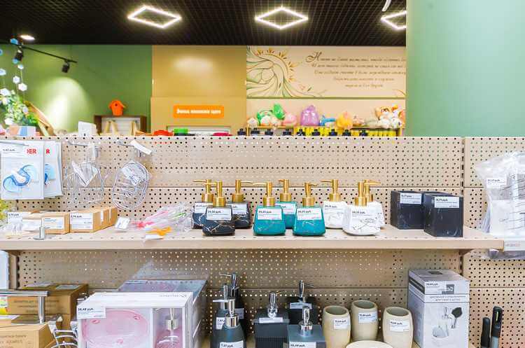 Товары для дома представлены вместе с привычным магазином OZ. Такое соседство позволило разнообразить выбор: в одном месте можно приобрести все необходимое, в том числе книги, игры, сувениры, продукты и предметы интерьера.