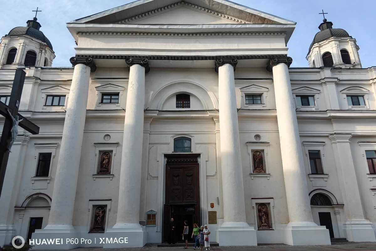Через дорогу от Драмтеатра – Кафедральный костел Святого Станислава, памятник архитектуры XVIII века. Здание выполнено в стиле западнобелорусского барокко с элементами классицизма. Но самое главное его богатство хранится внутри. Храм уникален благодаря своим фрескам второй половины XVIII века. В нем сохранился один из наиболее полных и профессиональных фресковых евангельских циклов в Беларуси. Роспись была создана местными мастерами славится своей оригинальностью и имеет большую художественную ценность.