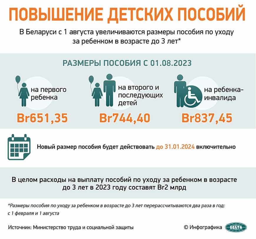 С 1 августа 2023 года по 31 января 2024-го размеры пособия составят: на первого ребенка - Br651,35, на второго и последующих детей - Br744,4, на ребенка-инвалида - Br837,45. Размеры пособия выросли на 7,5%.
