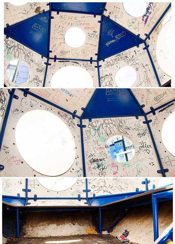 Что сейчас? «Убитые» тренажеры, на стенах «ракеты» — местами телефонный справочник, местами оскорбительные надписи и рисунки маркером. «Женя даун, Даник индюк» — гласит информация. Иллюминаторы разбиты, спортивные снаряды испорчены.