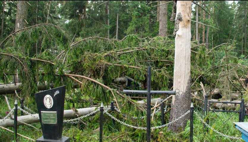 На Боровском кладбище после ураганных ветров упало много деревьев. Вывернутые с корнем огромные стволы рухнули на памятники и ограды. Решили посмотреть, что там происходит сейчас.