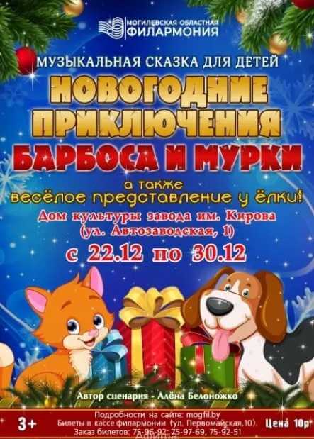 Могилевская областная филармония приглашает на «Новогодние приключения Барбоса и Мурки». Вас и ваших деток ждет праздничная атмосфера настоящего новогоднего чуда, в котором псу Барбосу и кошке Мурке вместе со зрителями предстоит пережить яркое и трогательное приключение. Представление у елки - тоже в программе.