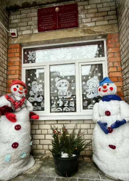 Очаровательные снеговики в школьном дворе