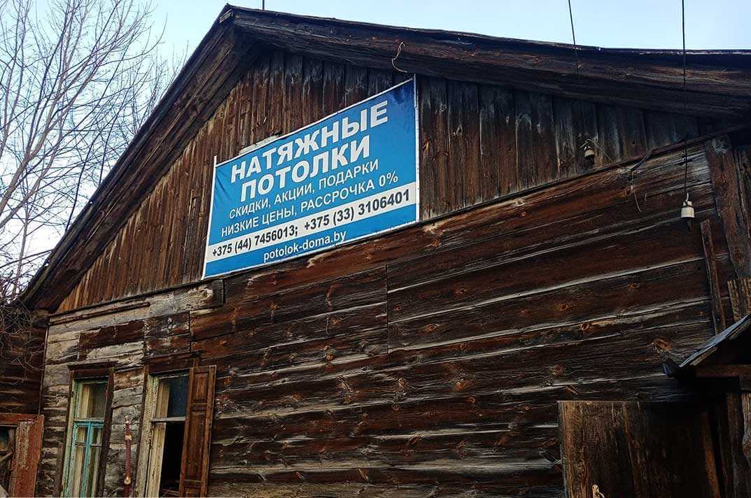 Во-первых, покосившийся от старости дом, рассказывает могилевчанам про полезные услуги. Во-вторых, снести давно непригодное для жилья строение — целая проблема, а яркие рекламные растяжки, как-никак, но скрывают убогий вид. Или подчеркивают?