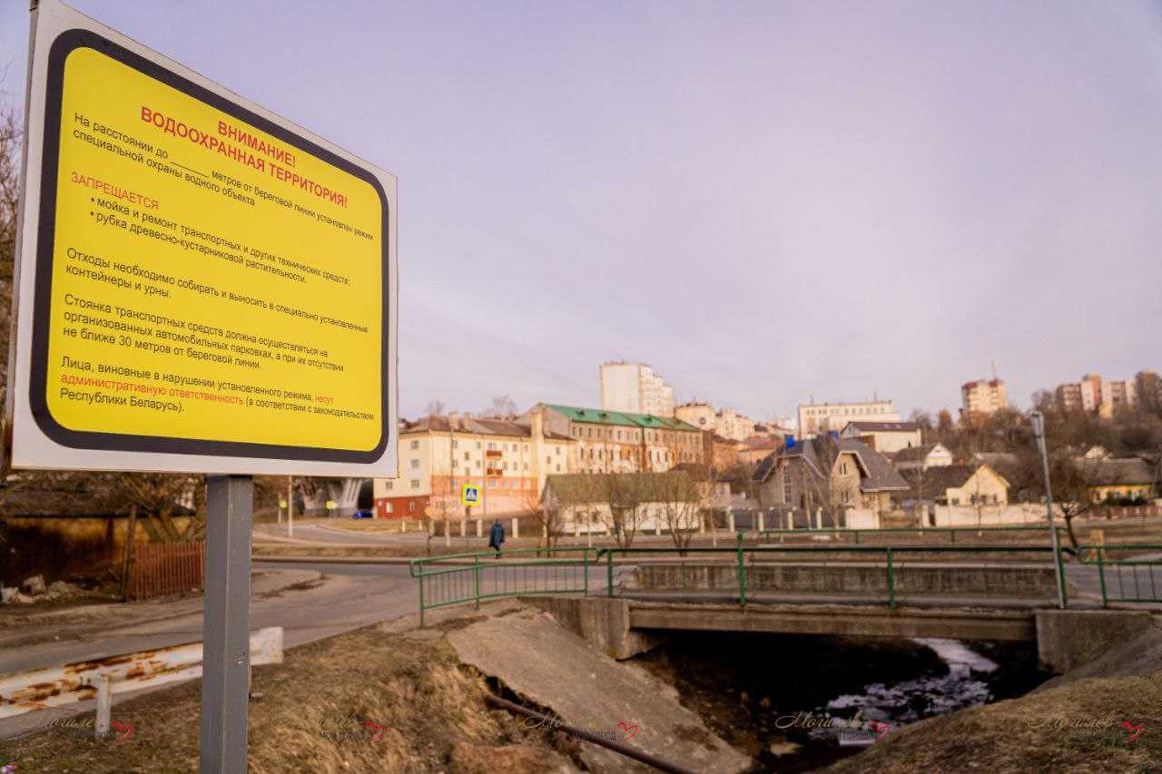 В ЯндексКартах исток реки обозначен аж на ул. Строителей, недалеко от магазина "Молодечномебель". Но оказалось, что здесь она уходит в трубу, а наш маршрут будет проходить в сторону Дубровенки. Минуя гаражный кооператив, переходим дорогу возле "Домочая" и спускаемся к Струшне. Табличка у реки сообщает, что это водоохранная территория. Здесь запрещена мойка авто, рубка растительности и стоянка ближе 30 метров от береговой линии.