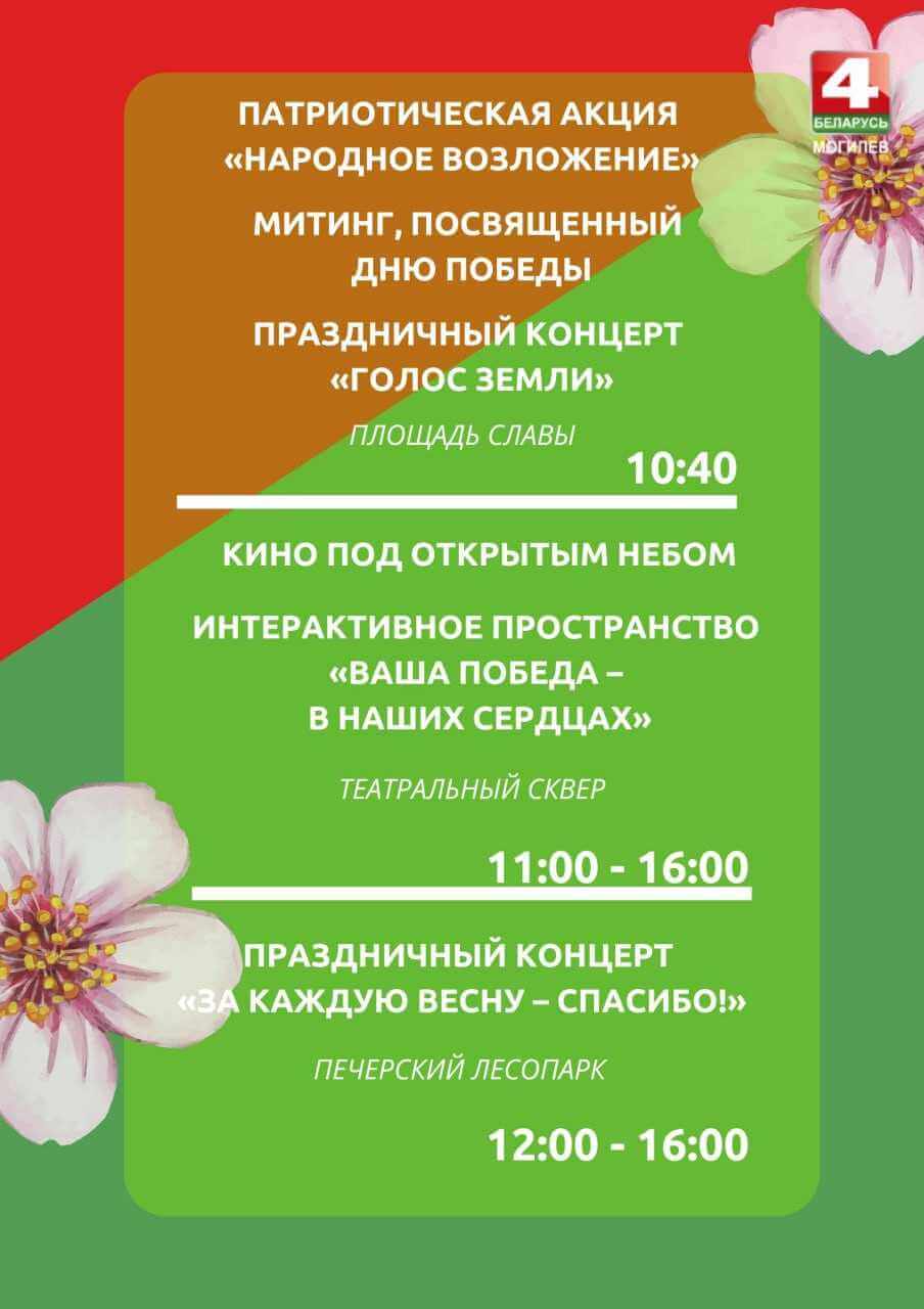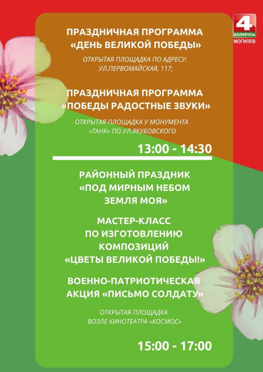 21.30 – Праздничная концертная программа «Помним сердцем» с участием коллективов и исполнителей г.Могилева, Заслуженного коллектива Республики Беларусь вокальной группы «Чистый голос»