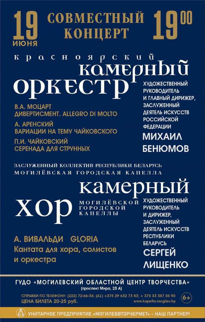 В наш город приедет камерный оркестр под руководством заслуженного деятеля искусств Российской Федерации Михаила Бенюмова. Также к ним присоединится камерный хор могилевской городской капеллы под руководством заслуженного деятеля искусств Республики Беларусь Сергея Лищенко.