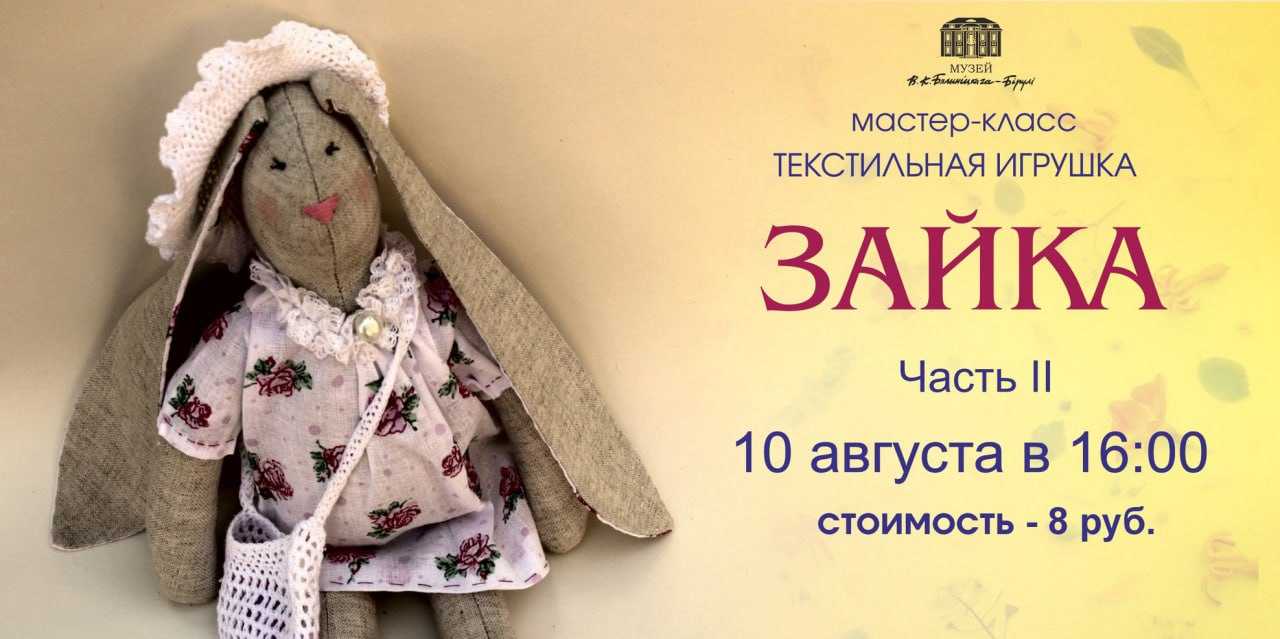 Мастер-класс по изготовлению текстильной игрушки «Зайка» состоится 10 августа в музее В.К. Бялыницкого-Бирули (ул. Ленинская, 37) в Могилеве. Начало мастер-класса в 16.00.