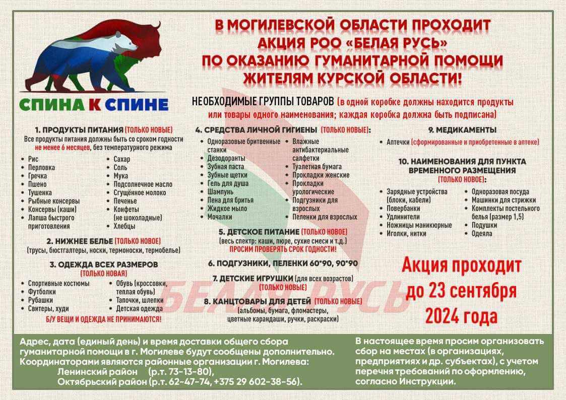 Со 2 по 23 сентября Республиканское общественное объединение «Белая Русь» проводит акцию «Спина к спине» по оказанию гуманитарной помощи жителям Курской области, в рамках которой любой неравнодушный человек может оказать посильную помощь нуждающимся жителям Курска путем сбора необходимых групп товаров.