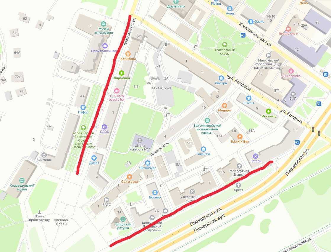 - ул. Архиерейский Вал Канисского, ул. Первомайская (на участке от улицы Болдина до площади Славы)