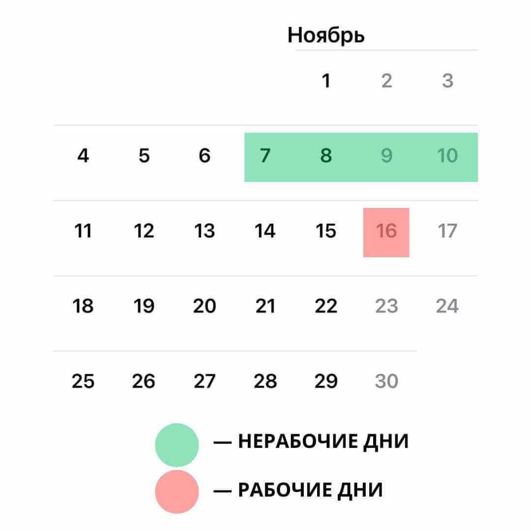 Рабочий день пятницы 8 ноября будет перенесен на субботу 16 ноября. А, значит, впереди четыре выходных дня подряд — с 7 по 10 ноября.