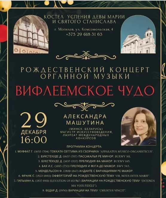 «Вифлеемские чудо» – так называется рождественский концерт органной музыки, который будет представлен 29 декабря в костеле Успения Девы Марии и Святого Станислава Могилева. Его исполнит магистр искусствоведение, лауреат международных конкурсов минчанка Александра Машутина.