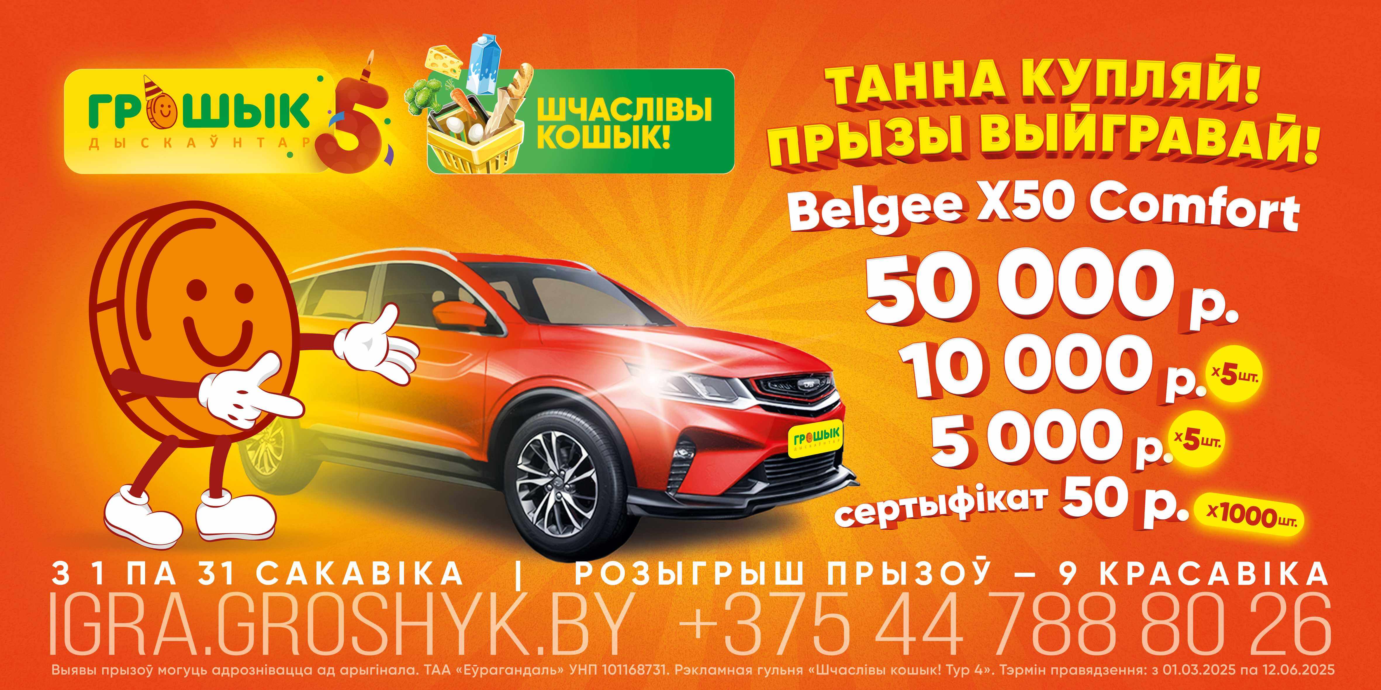 За три тура игры «Шчаслівы кошык!» с мая 2024 года по январь 2025 года было разыграно более 5300 призов на сумму почти 700 000 рублей! И сейчас у каждого покупателя сети дискаунтеров «Грошык» за покупки с 1 по 31 марта есть реальный шанс стать обладателем внушительных денежных призов, сертификатов на покупки или даже выиграть стильный, динамичный и яркий автомобиль BELGEE X50 Comfort!