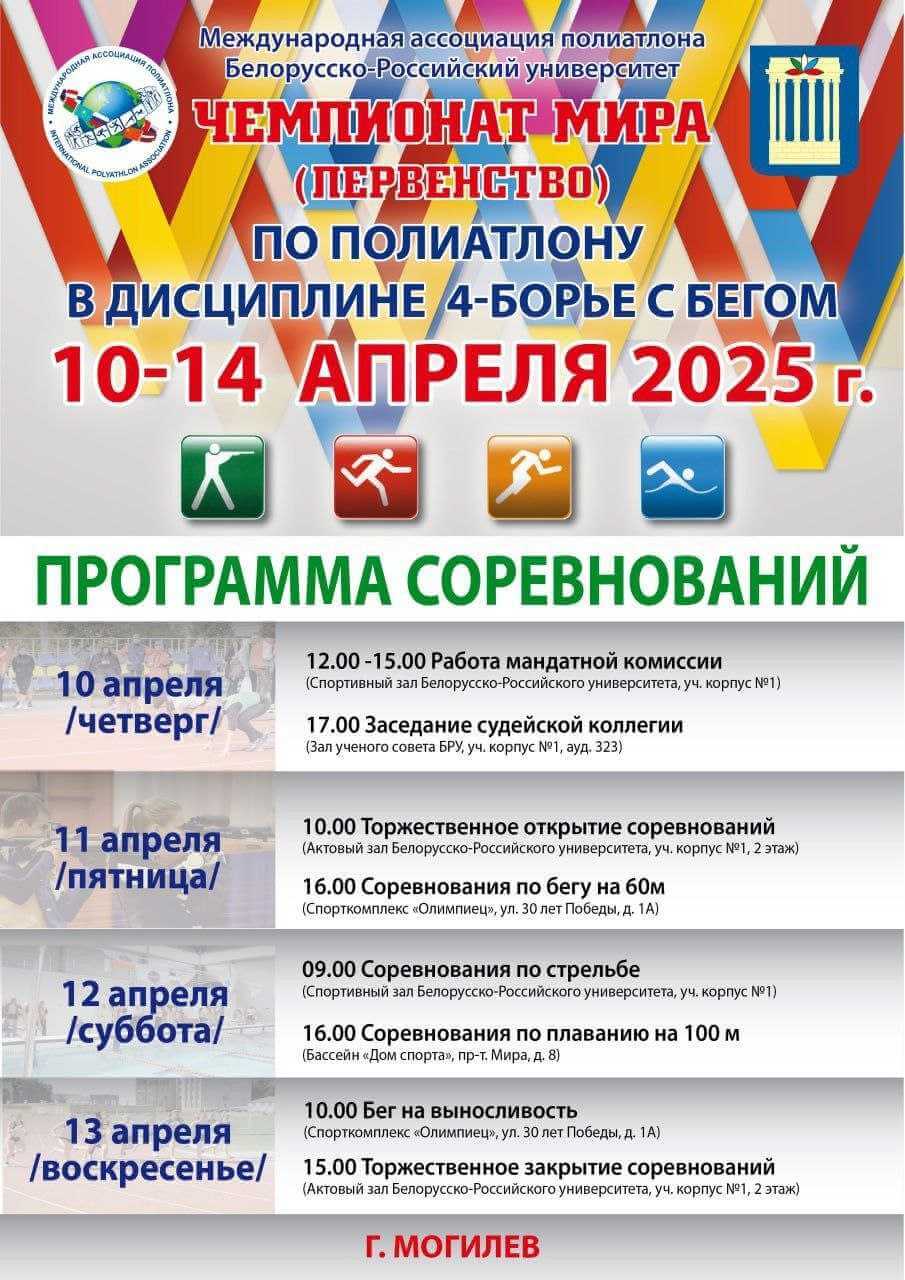 С 10 по 14 апреля на базе Белорусско-Российского университета, СК «Олимпиец» и «Дома спорта» пройдет чемпионат (первенство) мира по полиатлону.