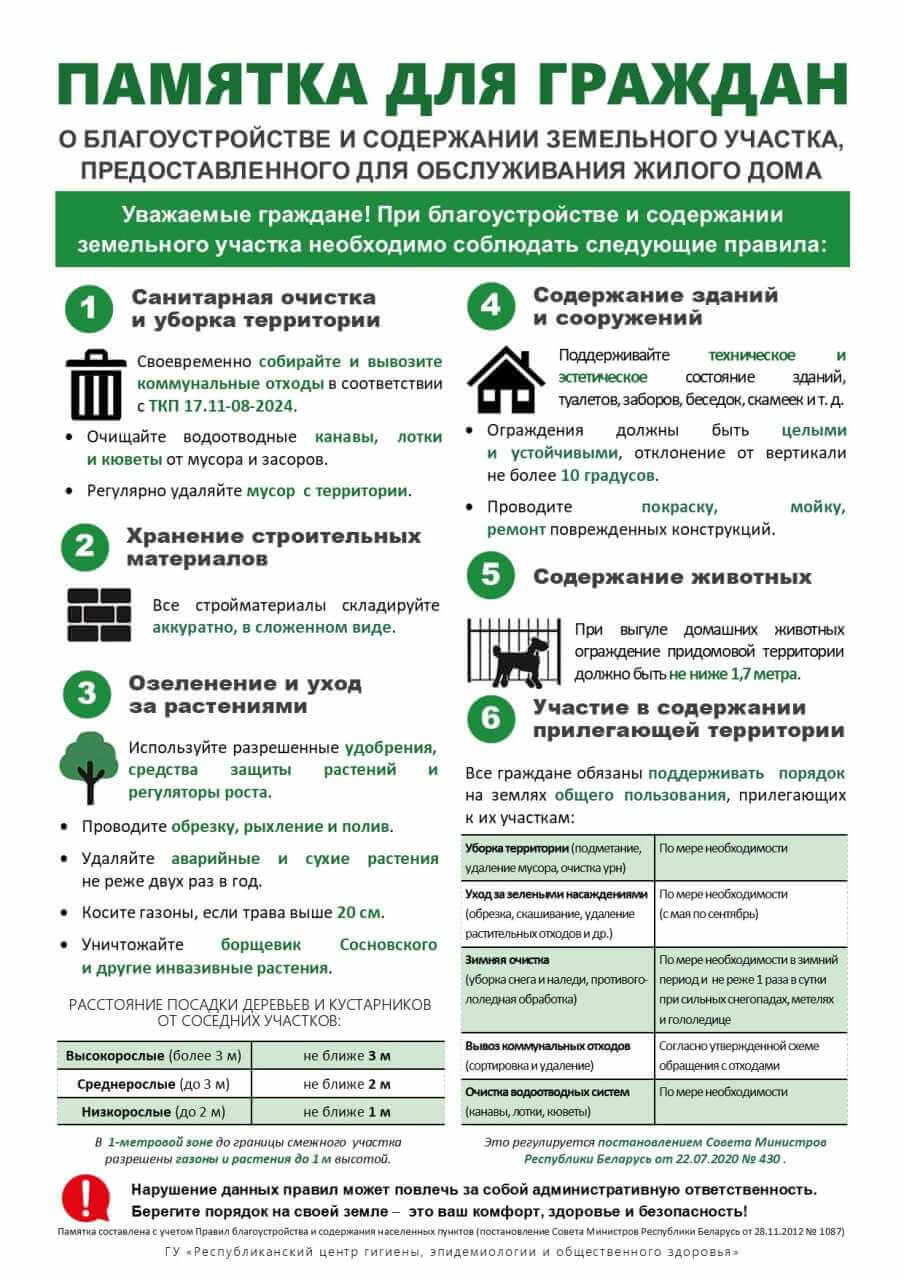 В связи с корректировкой Правил благоустройства и содержания населенных пунктов (постановление Совета Министров Республики Беларусь от 16 мая 2025 года № 267) Республиканский центр гигиены, эпидемиологии и общественного здоровья напоминает о правилах благоустройства и содержания придомовых территорий.