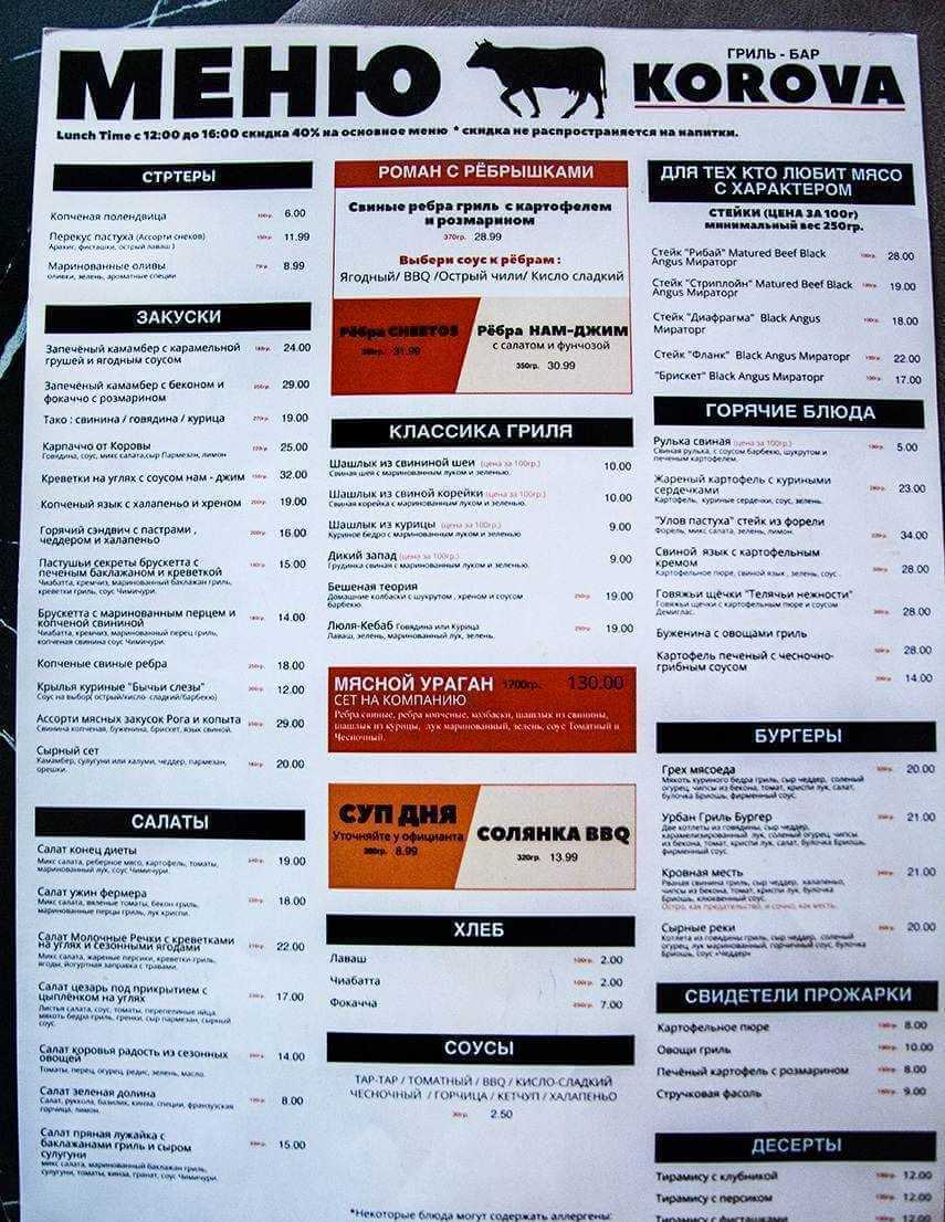 Теперь о том, что мы увидели внутри «Коровы». Очевидно, внутри — много мяса, но не только и не столько коровы: есть блюда из курицы, с морепродуктами и много свинины. Имеются бургеры, салаты и даже десерты. Разумеется — в меню присутствует алкоголь.