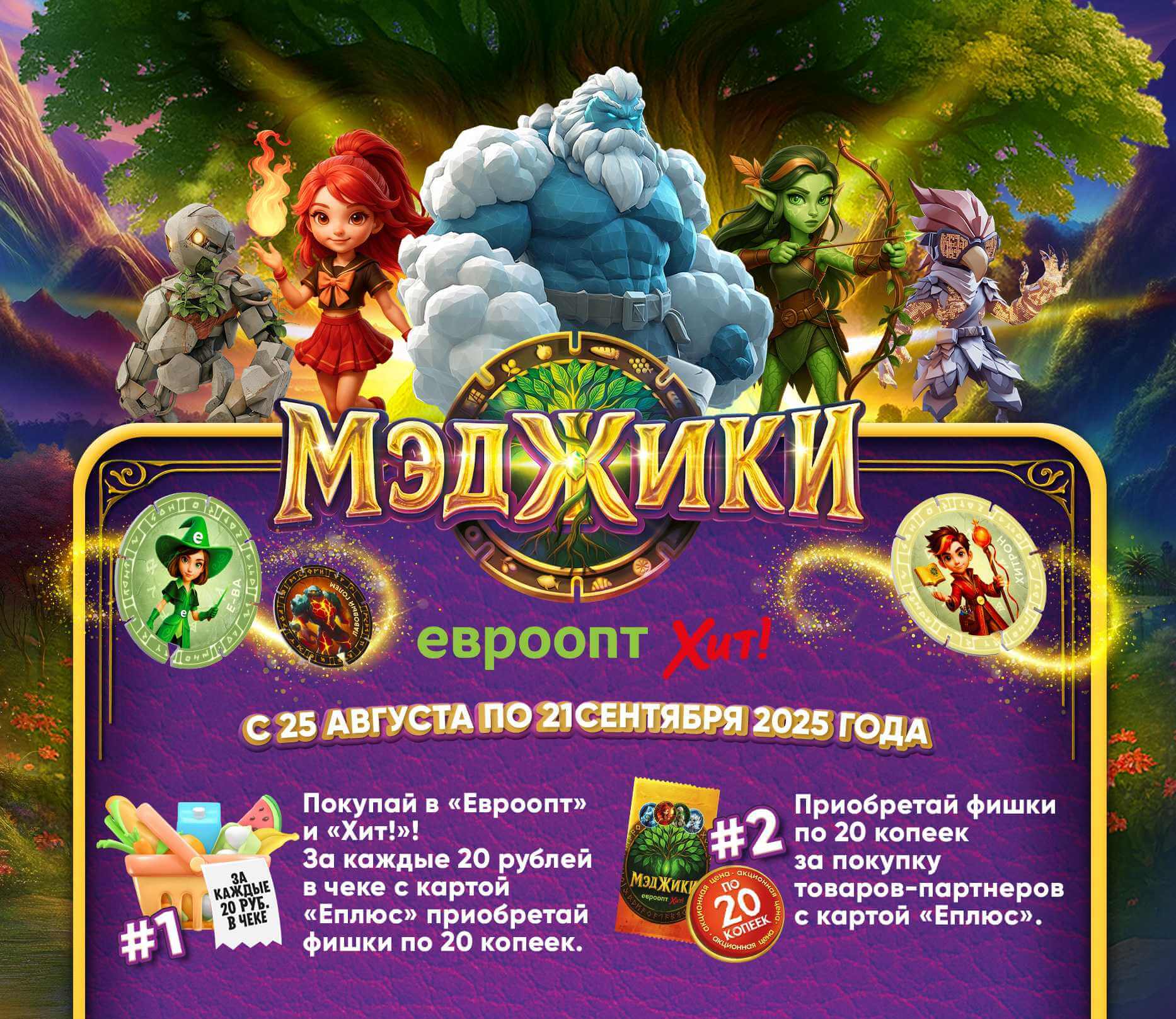 25 августа 2025 года в торговых сетях «Евроопт» и «Хит!» стартовала новая акция для покупателей – «МЭДЖИКИ». Это коллекция из 27 уникальных фишек с героями мира фэнтези, которые можно собирать, использовать в настольных играх, оживлять в специальном мобильном приложении и даже выиграть Sony PlayStation 5 Pro.