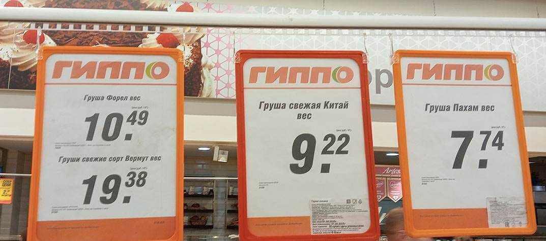 Едем в «Гиппо». Здесь яблоки можно купить по цене от 5,91 до 6,99. А вот цены на груши уже кусаются. Дешевле всего обойдется «Пахам» — 7,74 рублей, самые дорогие — «Вермут» аж 19,38 рублей.
