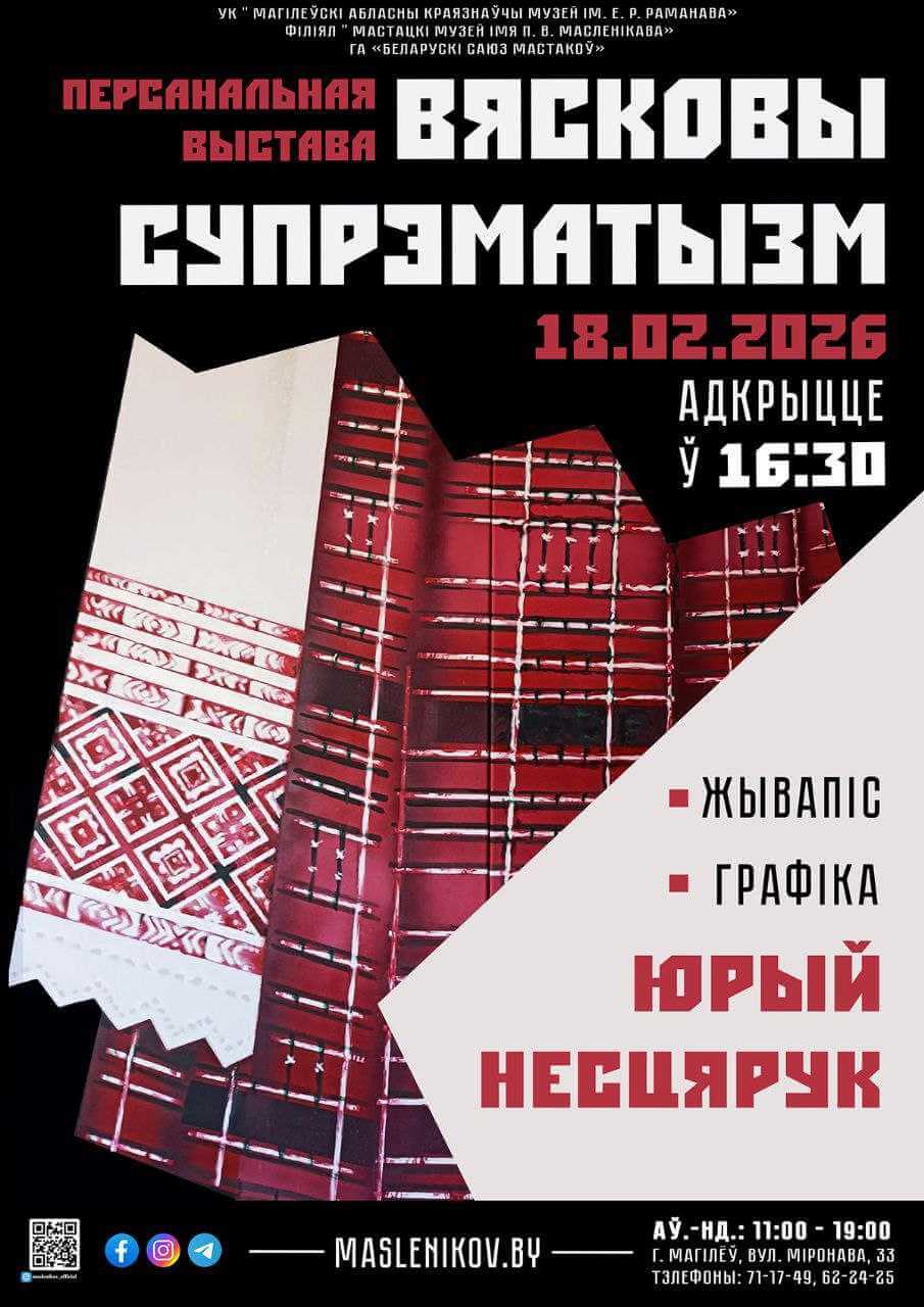Персональная выставка Юрия Нестерука «Вясковы супрэматызм» начнет работу 18 февраля в Художественном музее им. П.В.Масленикова (ул.Миронова, 33).