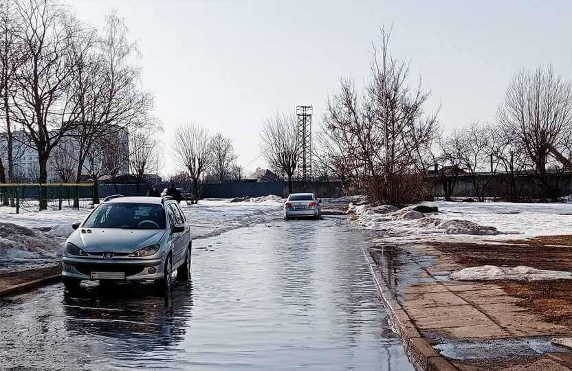 Лужа растянулась примерно на 100 метров в длину, и оккупировала подъезд к детскому садику. Более того, вероятно, это не предел — вода никуда не уходит, а тротуары еще скрываются под сугробами снега.
