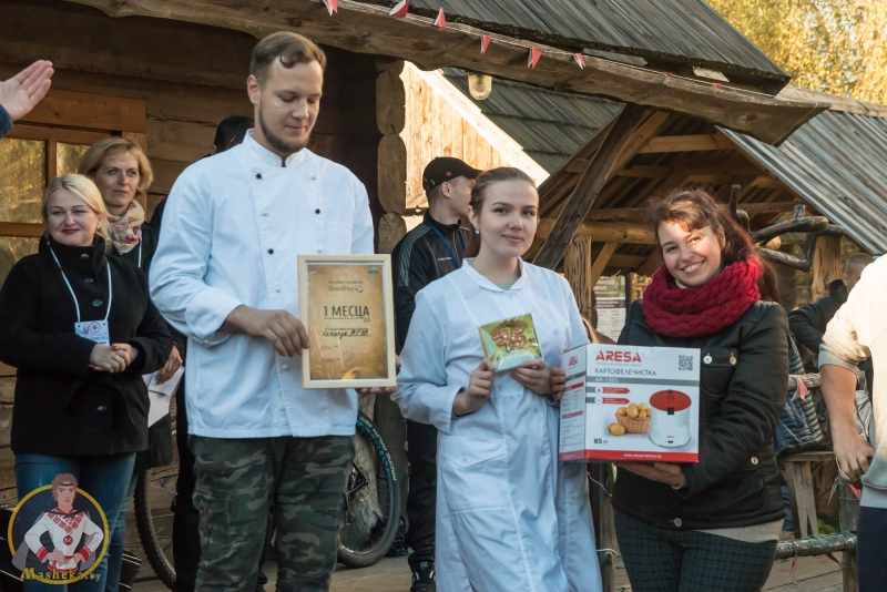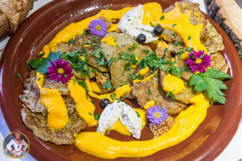Команда от университета продовольствия удивляла драником по старобелорусскому рецепту. Основной секрет блюда состоит в том, что в картофельную массу добавляется большое количество пассерованного лука. Драники подаются под сливочно-морковным соусом с французской горчицей и микрозеленью.